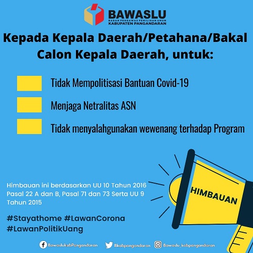 Himbauan tersebut merupakan ditindaklanjut dari Surat Bawaslu RI nomor : 0266/K.Bawaslu/PM.00.00/04/2020 tentang Pencegahan Tindakan Pelanggaran dan sesuai arahan dari Bawaslu Jabar untuk segara membuat himbauan secara tertulis kepada stake holder agar melakukan pencegahan tindak pelanggaran, yakni (1) stake holder dilarang lakukan politik uang terhadap bantuan. (2) ASN diminta netral, dilarang lakukan mutasi jabatan 6 bulan sebelum tanggal penetapan paslon, dan manfaatkan bansos yang menguntungkan/ merugikan paslon.