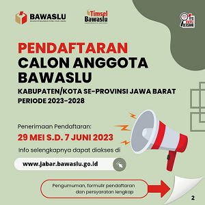 Dalam rangka pembentukan Bawaslu Kabupaten Kota di Wilayah Jawa Barat, maka Tim Seleksi Calon Anggota Bawaslu Kabupaten Kota di Wilayah Jawa Barat berdasarkan Surat Keputusan Ketua Bawaslu Nomor 325/KP.01.00/K1/04/2023 atas kewenangan yang diberikan oleh Undang – Undang Nomor 7 Tahun 2017 tentang Pemilihan Umum membuka kesempatan bagi Warga Negara Indonesia yang memenuhi persyaratan untuk mendaftarkan diri sebagai calon anggota Bawaslu Provinsi Jawa Barat masa jabatan tahun 2023 – 2028.