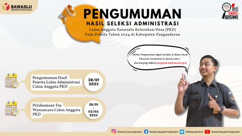 Berikut adalah Pengumuman Hasil Seleksi Administrasi Calon Panwas Kelurahan/Desa untuk Pemilu Tahun 2024 di Kabupaten Pangandaran, dapat diunduh pada tautan di berikut ini :