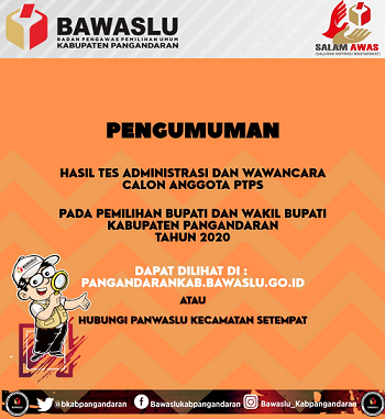 Bersama ini diumumkan nama-nama calon PTPS Se-Kabupaten Pangandaran Badan Pengawas Pemilihan Umum Kabupaten Pangandaran yang lulus Seleksi Administrasi dan tes Wawancara bisa di unduh pada tautan sebagai berikut: