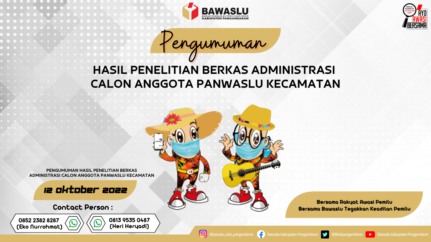 Bersama ini kami umumkan nama-nama yang lolos seleksi administrasi calon anggota Panwaslu kecamatan Kabupaten Pangandaran pada pemilu 2024 dapat di unduh pada tautan sebagai berikut: