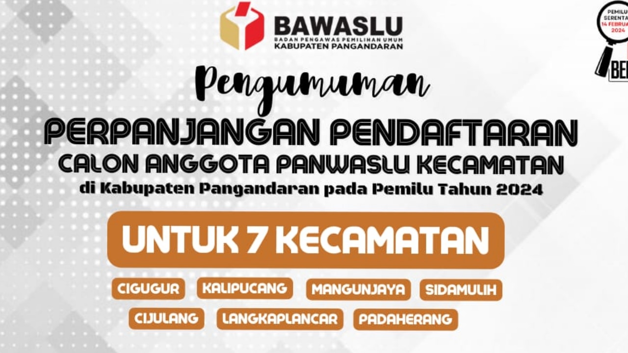 Pendaftaran Calon Anggota Panwaslu Kecamatan di Kabupaten Pangandaran pada Pemilu Tahun 2024, DIPERPANJANG untuk 7 Kecamatan.