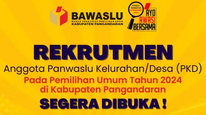 Panwascam se-Kabupaten Pangandaran membuka rekrutmen Pengawas Kelurahan/Desa untuk Pemilu 2024 lho.