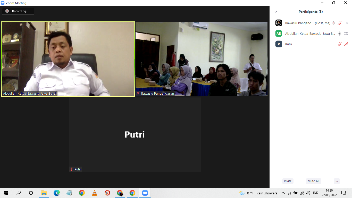 Pangandaran-Bawaslu Kabupaten Pangandaran melaksanakan sosialisasi Pengawasan Pemilu Partisipatif bersama Kader Pengawas Partisipatif Kabupaten Pangandaran di Hotel Malabar, Pangandaran. Rabu, (22/06/2022) Hadir melalui Daring, Ketua Bawaslu Jabar, Abdullah.