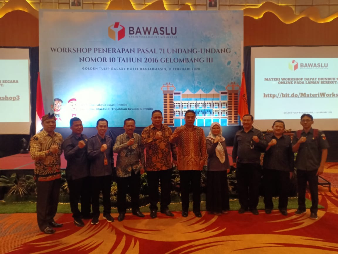 Banjarmasin,Bawaslu Kabupaten Pangandaran, Koordiv Divisi Penindakan Bawaslu Kabupaten Pangandaran Uri Juwaeni,S.Ag menghadiri undangan Workshop Penerapan Pasal 71 Undang-undang Nomor 10 Tahun 2016 tentang Perubahan Kedua Atas Undang-undang Nomor 1 Tahun 2015 tentang Penetapan Peraturan Pemerintah Pengganti Undang-Undang Nomor 1 Tahun 2014 Tentang Pemilihan Gubernur Bupati dan Walikota (11/02/2020)